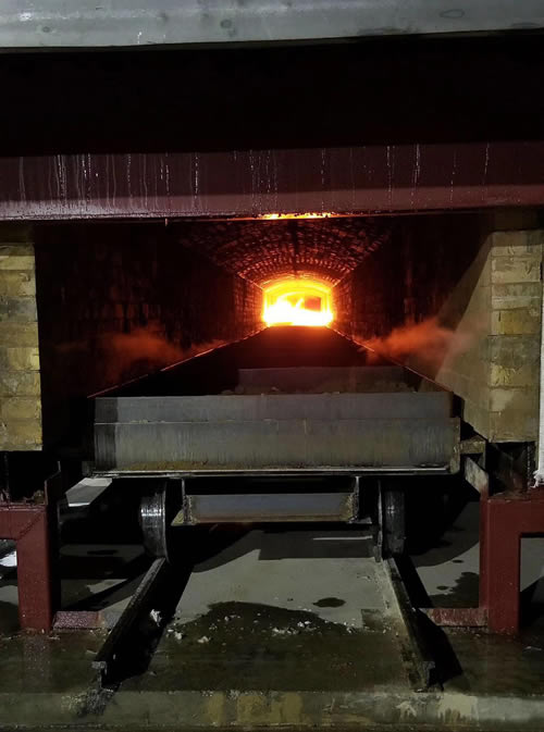 隧道爐由爐體、爐門、臺(tái)車、臺(tái)車轉(zhuǎn)移平臺(tái)、液壓推料機(jī)構(gòu)、燃燒系統(tǒng)、排煙系統(tǒng)、測(cè)溫系統(tǒng)等組成。隧道窯整個(gè)爐膛分為預(yù)熱段、加熱段及均溫段三段。